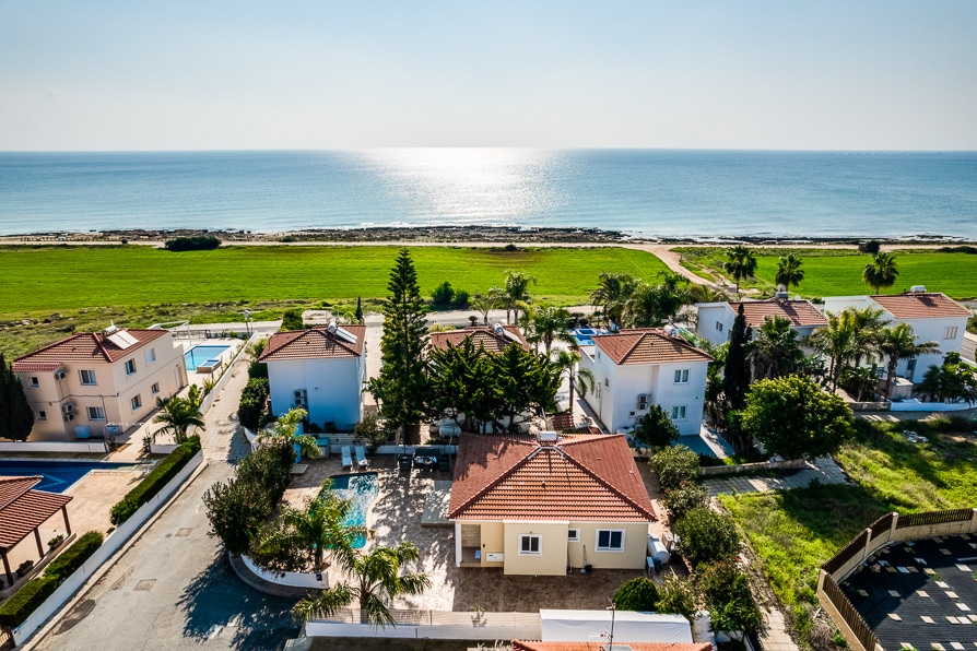 50 meters from the sea, this is a perfect choice for couples, families and friends that would like to enjoy their holiday in a close to the beach establishment in Ayia Thekla. The villa has an open plan design, with comfortable sofas, TV, dining table and a fully equipped kitchen with modern appliances. You can access the large veranda with an outside dining area and the swimming pool from the lounge. All rooms are fully air conditioned with free Wifi throughout.
