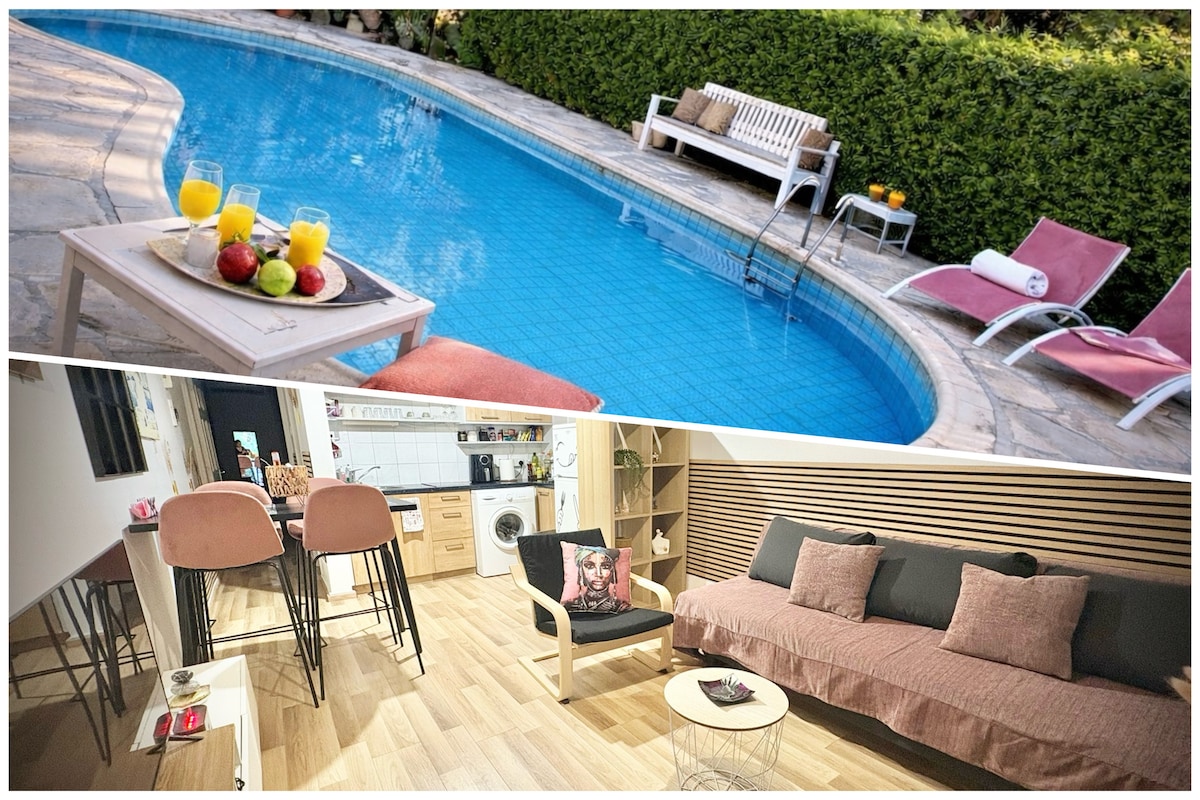 Step into serenity! Escape to a sun-soaked hideaway on a tranquil hillside. Lounge by the pool, soak up the sun, and savor breathtaking sea views and golden sunsets. Just a 15-minute drive from Paphos, our two charming studios are the perfect base to explore. Beaches, nature trails, Harbour, Blue Lagoon, and Paphos old town, are all 15–30 min. drive. Free Wi-Fi, parking, a village square with taverns and a vino bar, just a 4-min. drive. Car is essential.Pool open all year-round (not heated).