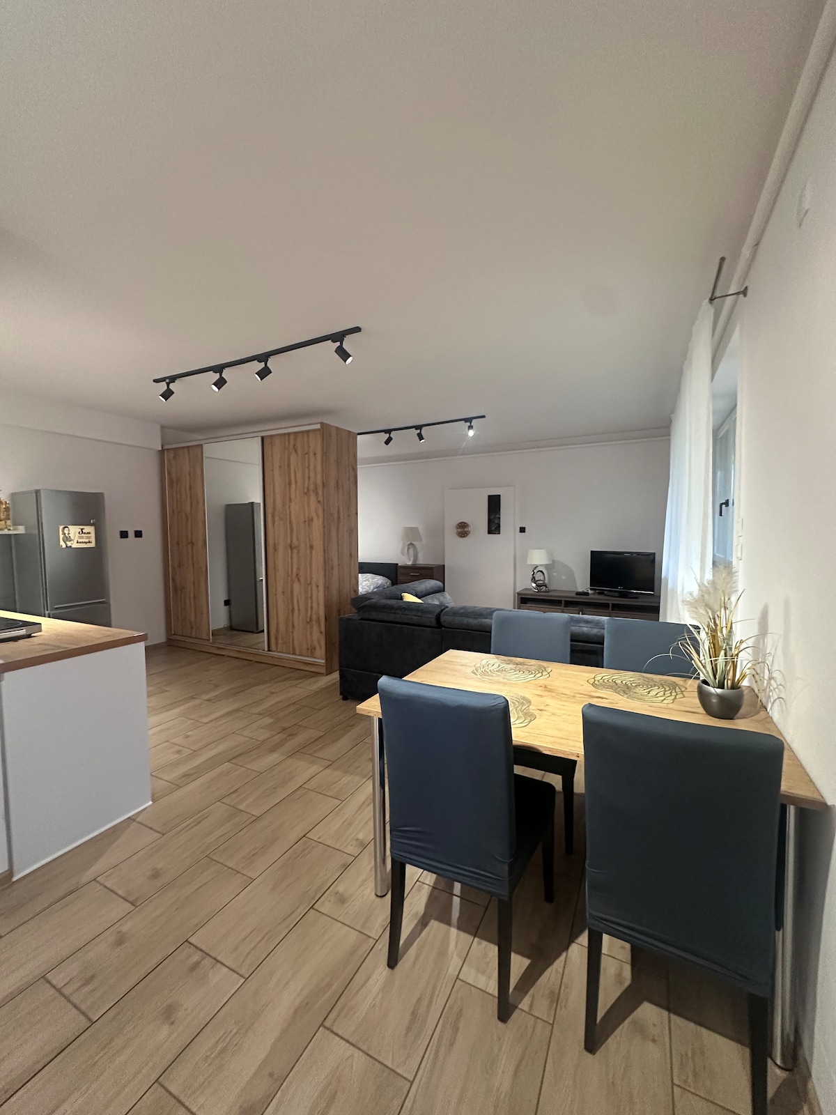 Comfortable, fully equipped apartment in a new building. A living room with an open kitchen divided into a dining and sitting area. The bedroom has a queen bed and a spacious closet. There's also a walk-in closet as an extra storage space. There are shops, restaurants and cafes in the area Equipment: air conditioning, coffee maker, kettle, iron, ironing board, washing machine Directions from Chopin Airport 20 min taxi 50 min communication from Modlin Airport 50 min taxi 120 min communication