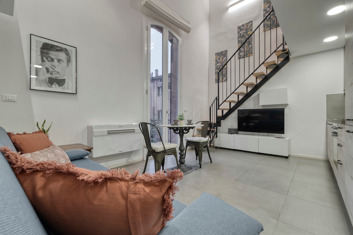 Quiet and comfortable apartment on 2 floors of 100 sqm with terrace, located in the heart of the historic center. A stone's throw from Piazza Maggiore. The building is located on the top floor with an elevator. Consisting of an open space living area with kitchen, 2 bathrooms and a bedroom with a double bed. Convenient bus service to/from the train station, airport shuttle and bus to the Fiera. Beautiful terrace overlooking the rooftops and churches of Bologna. A truly suggestive corner to call home